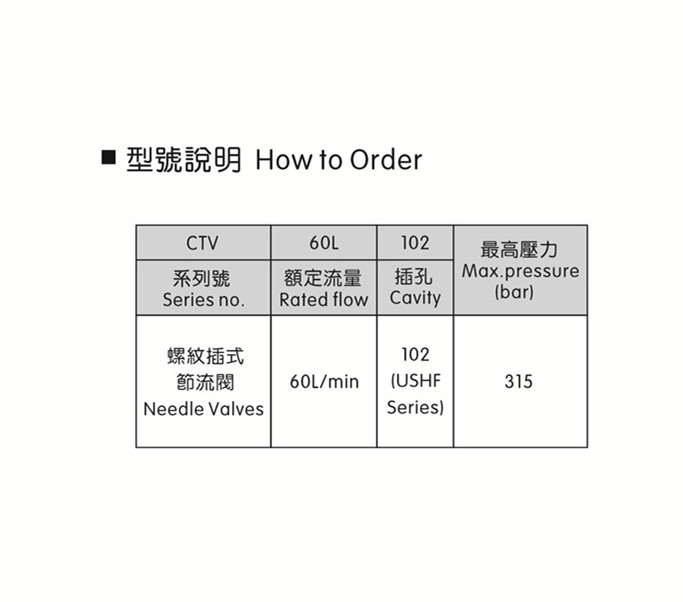 * 该阀可双向调节流量大小至 完全关闭, 适用于不需压力 补偿, 油路做精密控制使用。 采用V型设计调节杆, 因此流 量稳定, 不受油浓度因油温改 变而产生误差。